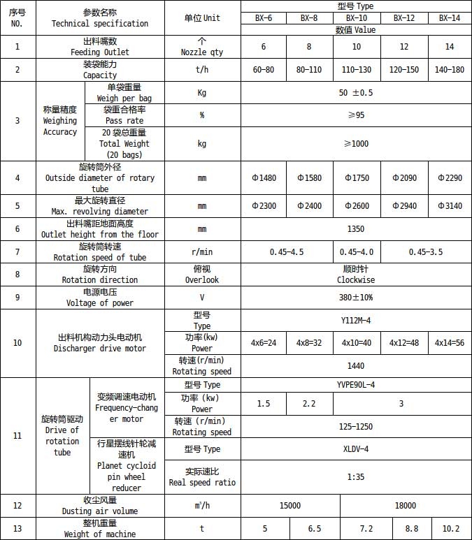BX型回轉(zhuǎn)式水泥包裝機采用變頻調(diào)速的主傳動系統(tǒng),偏心入料的回轉(zhuǎn)結(jié)構(gòu),配置有無觸點接近開關(guān),上下料位測控等機電自動控制及微機自動計量裝置。在操作過程中,除人工插袋外,其它如水泥袋壓緊、灌裝、計量閘板啟閉、定點掉袋等均可自動連續(xù)完成。并具有不插袋不灌裝,袋重不達到設(shè)定值不掉袋,袋子意外脫落立刻關(guān)閉閘板停止灌裝等獨特功能。包裝機設(shè)計有六嘴、八嘴、十嘴、十二嘴、十四嘴機型,根據(jù)用戶需要還可承接特殊類型的包裝機設(shè)計改造工作。