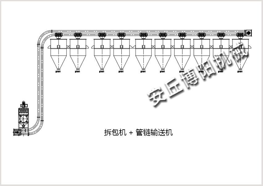 四、多點(diǎn)出料管鏈輸送機(jī)應(yīng)用:可給多個料倉、多個反應(yīng)釜、多臺混合機(jī)、多臺設(shè)備供料 等